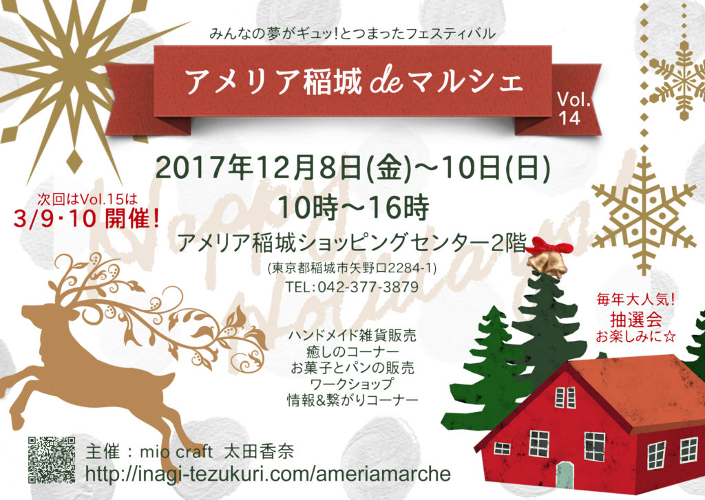 アメリア稲城deマルシェのフライヤーが完成しました。 今回はクリスマスマルシェでクリスマスの雰囲気を大切に 主催者の太田さんといっしょにつくりました。 3日間、わたしもお手伝いに入ると思います。 たのしみ!!! -