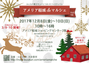 アメリア稲城deマルシェ Vol.14 2017 11/21 2017年11月21日 アメリア稲城deマルシェのフライヤーが完成しました。 今回はクリスマスマルシェでクリスマスの雰囲気を大切に 主催者の太田さんといっしょにつくりました。 3日間、わたしもお手伝いに入ると思います。 たのしみ!!! event この記事が気に入ったら いいねしてね! よかったらシェアしてね! URLをコピーしました! URLをコピーしました! HPはじめました いなぎコミュニティビジネスクラブ 関連記事 いなぎコミュニティビジネスクラブ 2018年4月16日